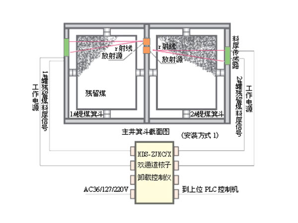 系統結構示意圖 系統設備組成由帶輻射輸出器、屏蔽罐的放射源;射線探測器和固定支架等構成殘留煤厚信號采集部分,由AC127V電源和本安24位單片機等構成控制主機,由本安固態繼電器版、 接線箱等構成料后信號輸出、輸出控制部分。其中放射源經國家環保部門檢測,符《GB4792-84》安全標準,不會對人體產生損傷,請用戶放心!系統工作原理簡述放射源輸出的γ射線穿透機斗鋼板和機斗內卸載后殘留煤,被射線探測器接收,轉換成電信號給控制主機。射線穿透鋼板和殘留煤層時要被部分吸收,被吸收的量與殘留煤層的厚度成一定的對應關系。探測器輸出的電信號強度與殘留煤層的厚度具有一一對應關系。控制儀主機通過檢測電信號的強度按一定的數學模型、公式,就可得出被測截面卸載殘留煤的厚度,并按設置上、下限值進行遠傳報警輸出。實用性及功能實現◇ 該系統可對主井箕斗卸載進行有效安全控制,以免箕斗重載下放或二次裝載的事故發生。◇ 控制主機可檢測箕斗被測載面卸載殘留煤的厚度值,按預設的上、下限報警值進行報警。◇ 給出上位主機PLC的殘留煤厚度報警值,為經繼電器隔離的干接點信號(常開或常閉)。